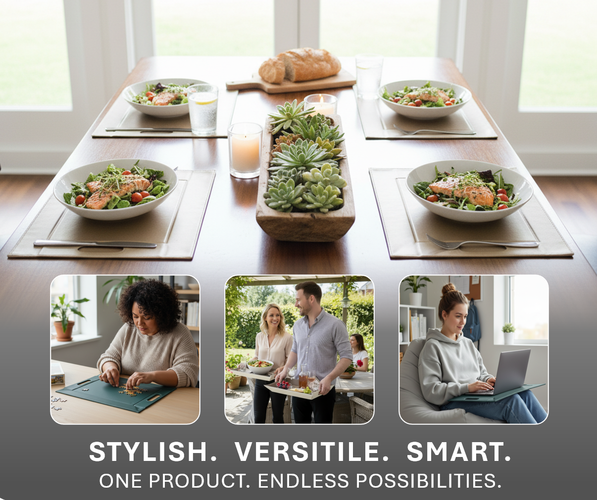 One product. Endless possibilities. The award-winning European design provides a stylish, reversible placemat that transforms into a sturdy serving tray, making every meal, project, and moment effortless. Carry breakfast in bed, serve drinks on the patio, snacks at the couch, work from your laptop in style, or keep projects and crafts contained — all with one sleek design.