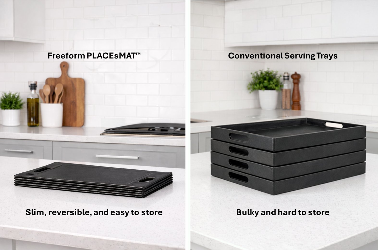 Discover the Freeform PLACEsMAT™ — the award-winning innovation that combines style and function. This stylish placemat instantly transforms into a sturdy serving tray, letting you carry meals, snacks, and drinks with ease. Its slim profile stores flat to save space, replacing bulky trays and flimsy placemats with one versatile, modern solution.